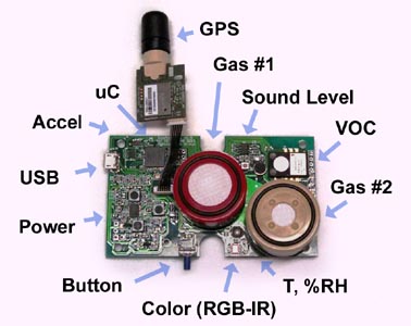 We have developed portable wearable environmental monitors that measure individual exposure levels of environmental parameters including: air quality gas concentrations, lighting color spectrum, and sound levels. The monitor also include a 3-axis accelerometer to measure activity level and air intake, as well as a GPS module to measure location.