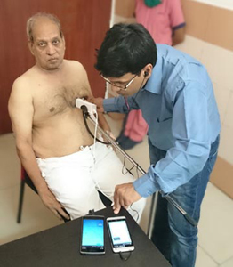 Although the electrocardiogram (ECG) is widely used for monitoring the heart and diagnosing certain types of heart disease, the ECG cannot measure mechanical cardiac function. We are developing a mobile microwave doppler probe that can record and analyze the mechanical motion of the heart and detect abnormalities. We call this device the Microwave Cardiogram or MCG. The signals produced by the MCG are similar to an M-mode echocardiogram trace. This device is conveniently powered by the mobile phone itself and can be used through clothing, which is a significant advantage in providing medical assistance in the field for disaster relief or battlefield first aid. Our device has being tested in the Sengupta Research Hospital in Nagpur, India.
